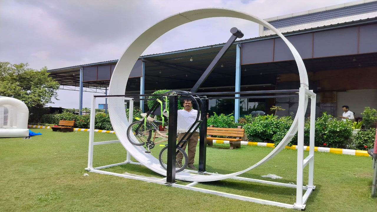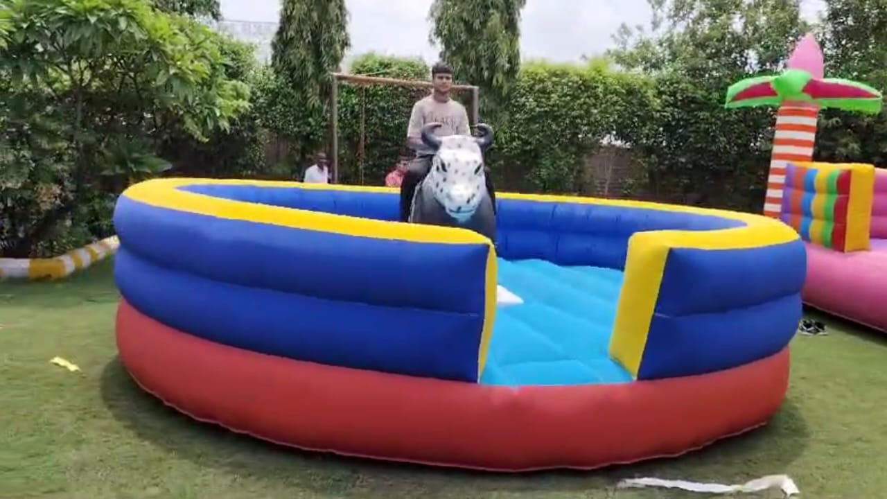 Shakya Amusement Pvt Ltd delivered a customized 4-lane inflatable bouncy slide made with premium 560 GSM SRF PVC coated fabric. 16 ft Bull ride game. 360 degree Cycle Ride. Best quality Bubble house. The design was optimized for safety, durability, and attractive theme visuals to increase customer engagement.